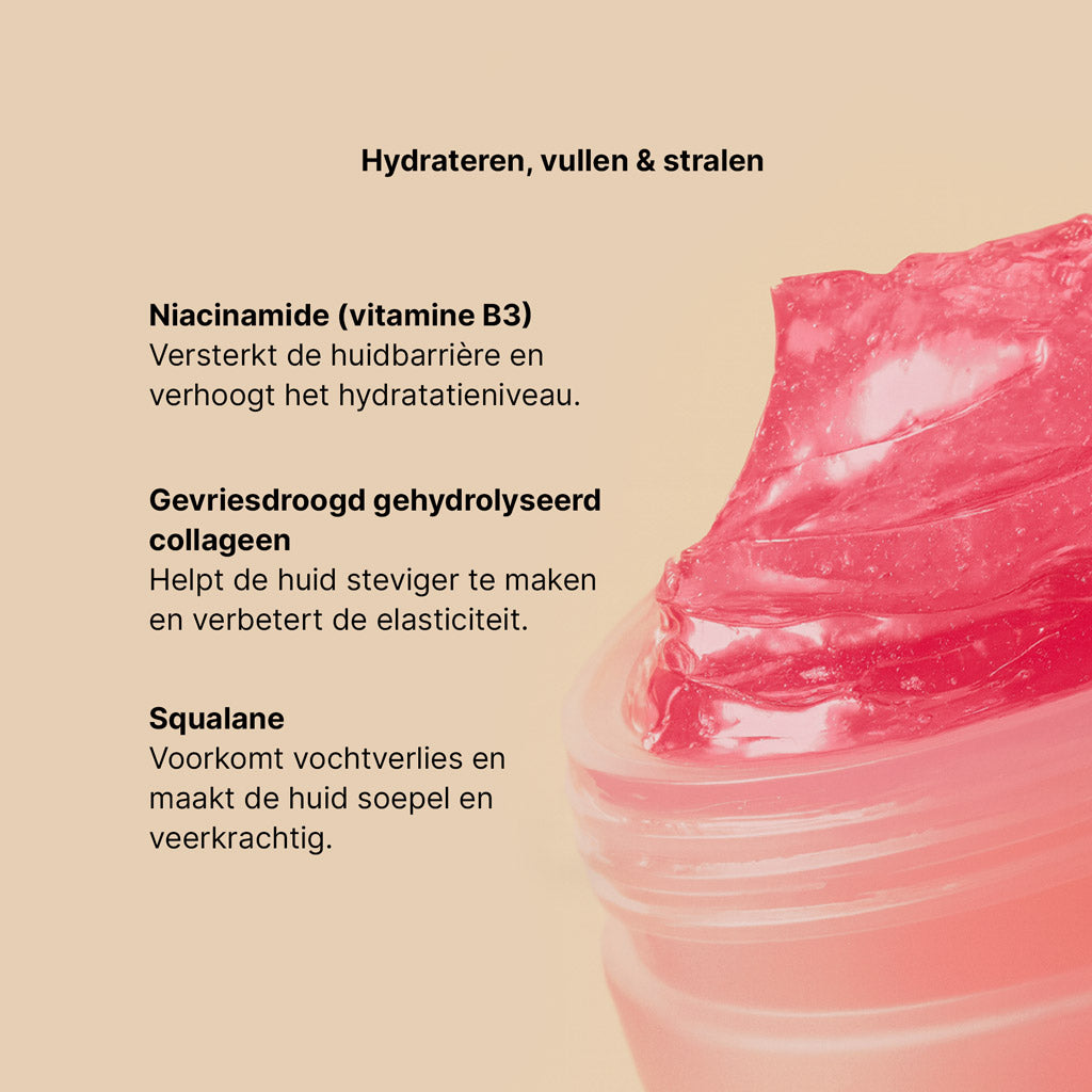 De unieke jellytextuur is verrijkt met hydrolyzed en oplosbaar collageen, die helpen om de elasticiteit te verbeteren en fijne lijntjes zichtbaar te verminderen. De lichte formule trekt snel in, zonder te plakken, en laat de huid soepel, glad en stralend aanvoelen.