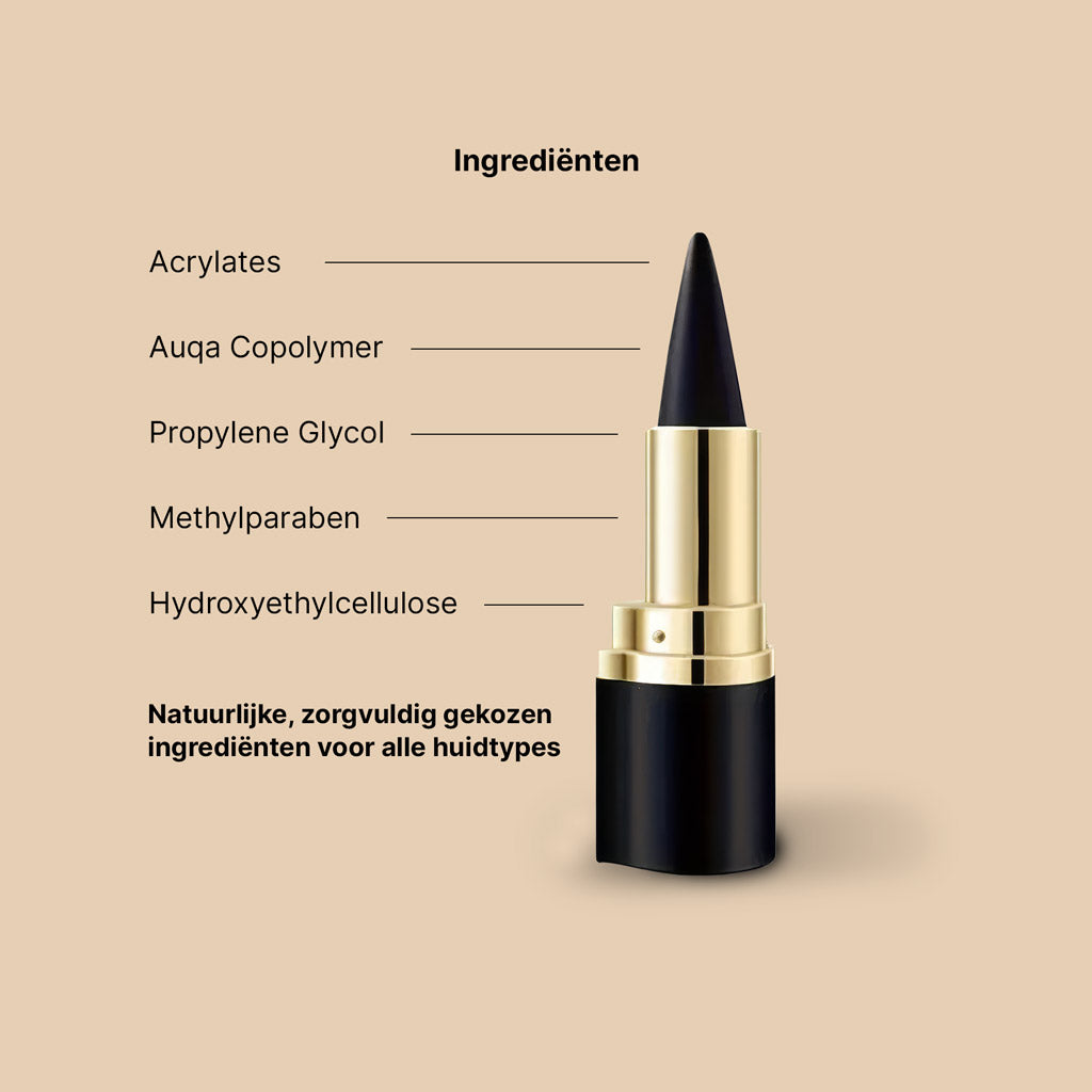 Breng de eyeliner aan op schone, droge oogleden. Gebruik de precisiepunt om een dunne lijn te trekken langs de wimperrand. Voor een natuurlijke look gebruik je lichte druk, voor een intensere look bouw je de lijn langzaam op. Laat even drogen voor een waterproof resultaat dat de hele dag blijft zitten.